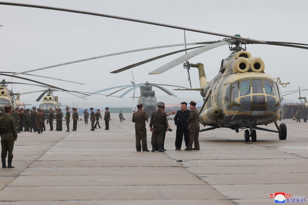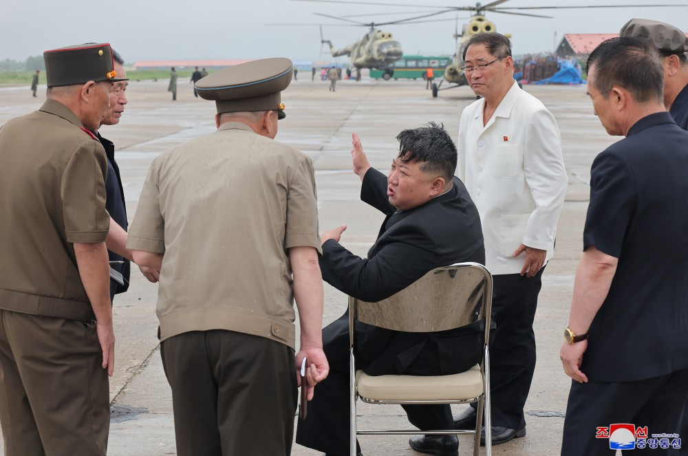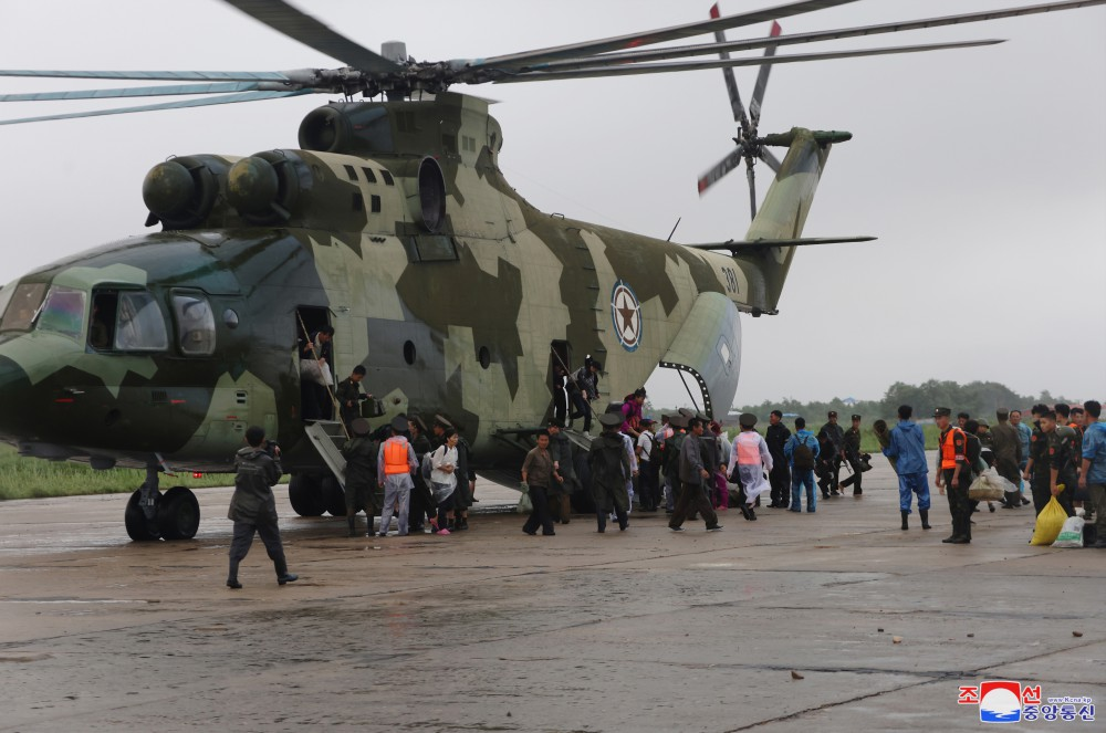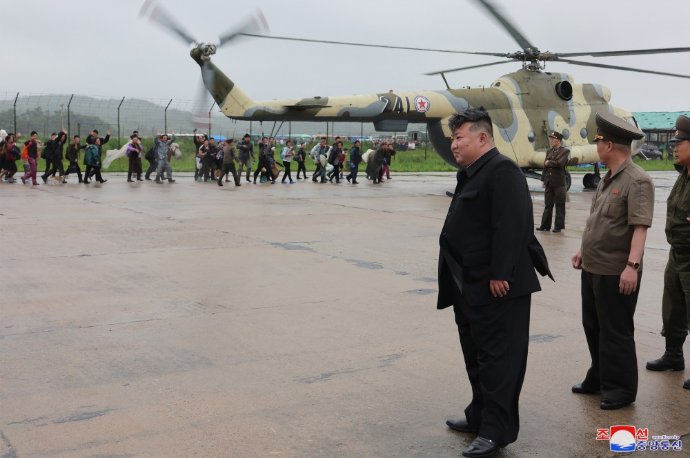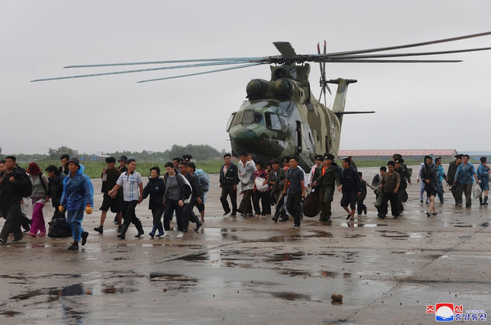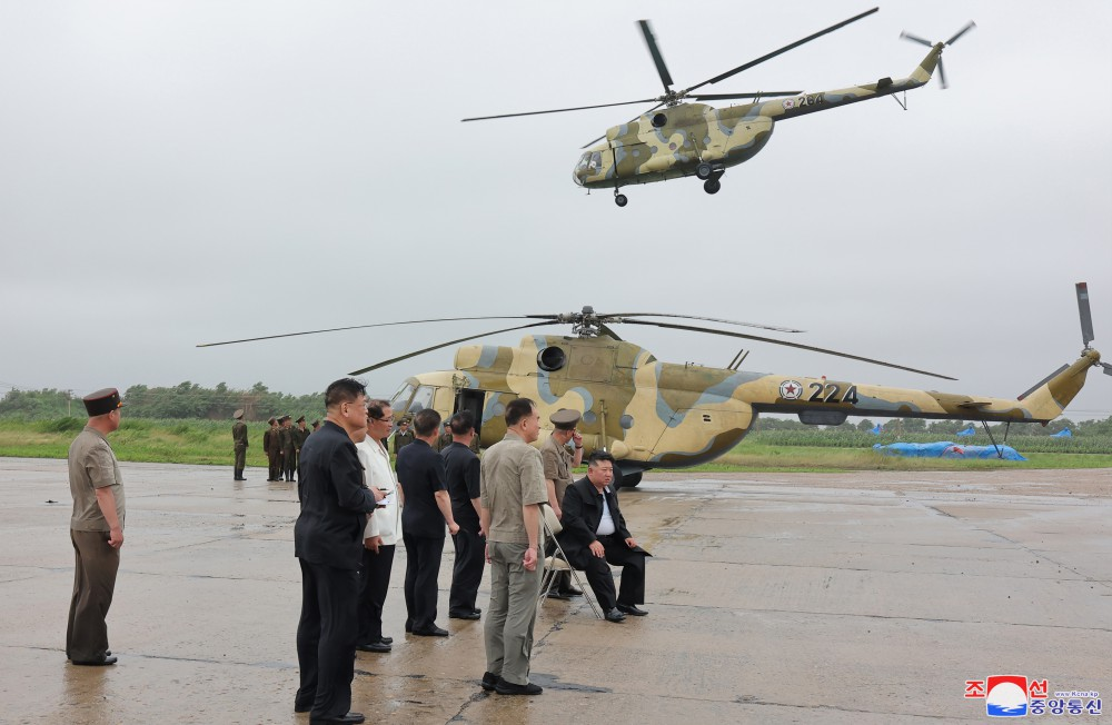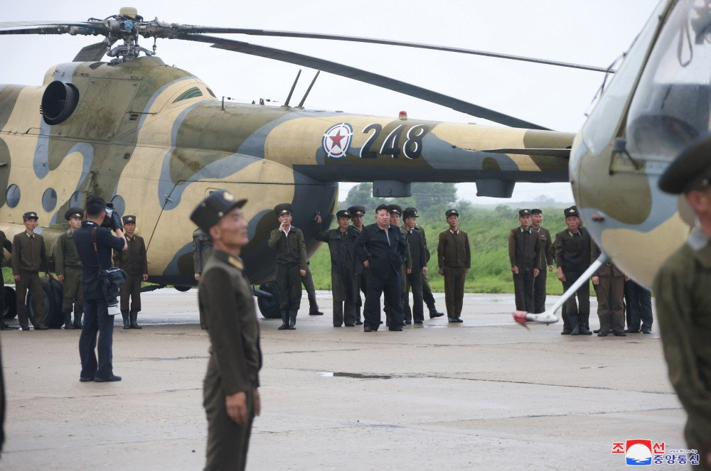 Na base aérea onde se travava a campanha de resgate e aonde chegou depois de percorrer estradas inundadas de água, Kim Jong Un recebeu o relatório dos comandantes sobre a situação de moradores isolados e a operação de resgate.