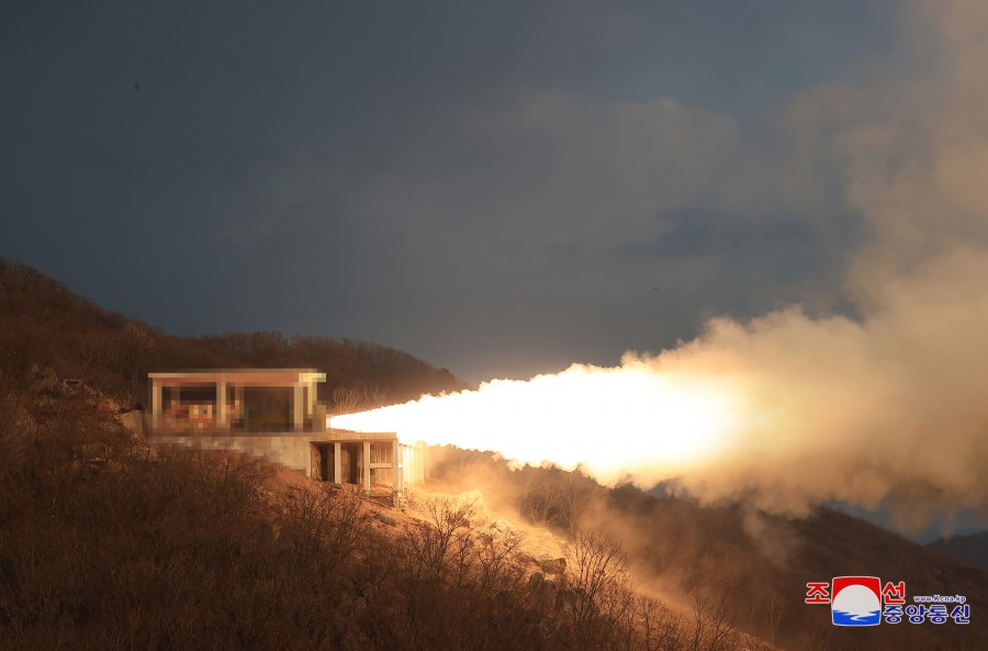A Direção Geral de Mísseis da RPDC e seu instituto de motores realizaram na manhã e tarde do dia 19 no Campo de Lançamento de Satélites Sohae esse teste do motor multifásico que será instalado no míssil hipersônico de alcance intermediário, de acordo com o programa de desenvolvimento de novos sistemas de armamento.