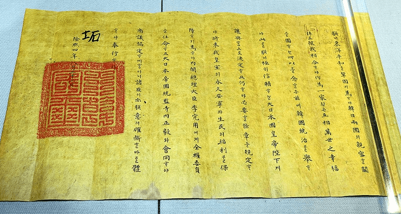 Este pacto fraudulento e ilegal perseguia o objetivo de justificar a ocupação do território coreano pelos agressores japoneses.