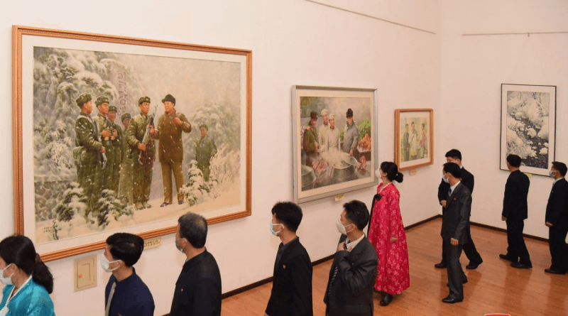 Também saltam à vista as pinturas que descrevem as mudanças maravilhosas acontecidas na pátria, que acolheu a nova era de prosperidade e desenvolvimento sob a guia do estimado camarada Kim Jong Un, o inesgotável poderio estatal e o aspecto feliz da população.