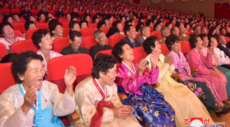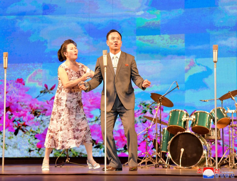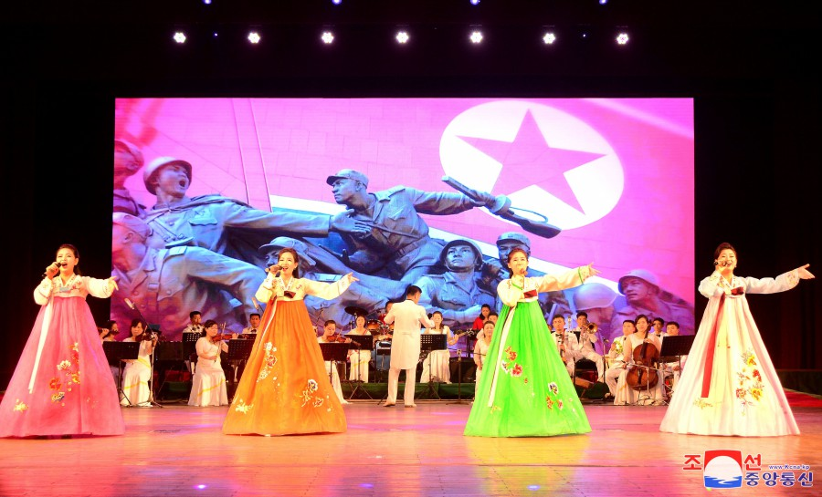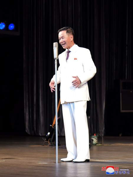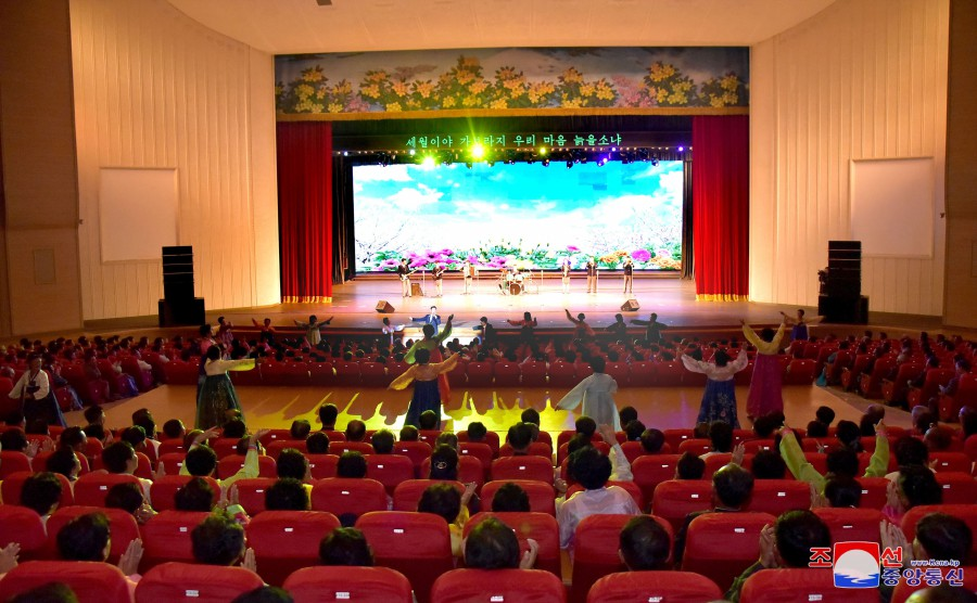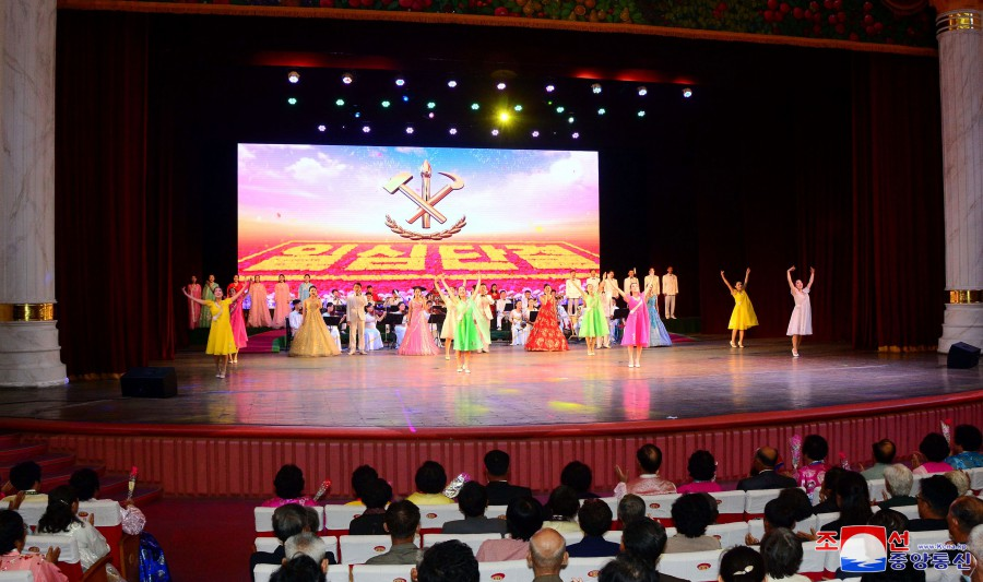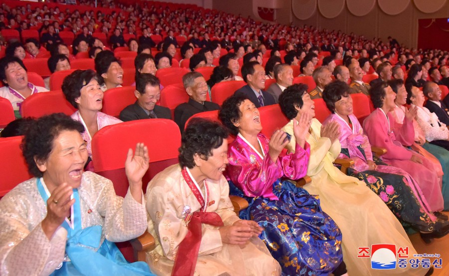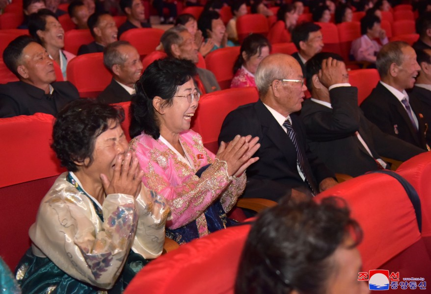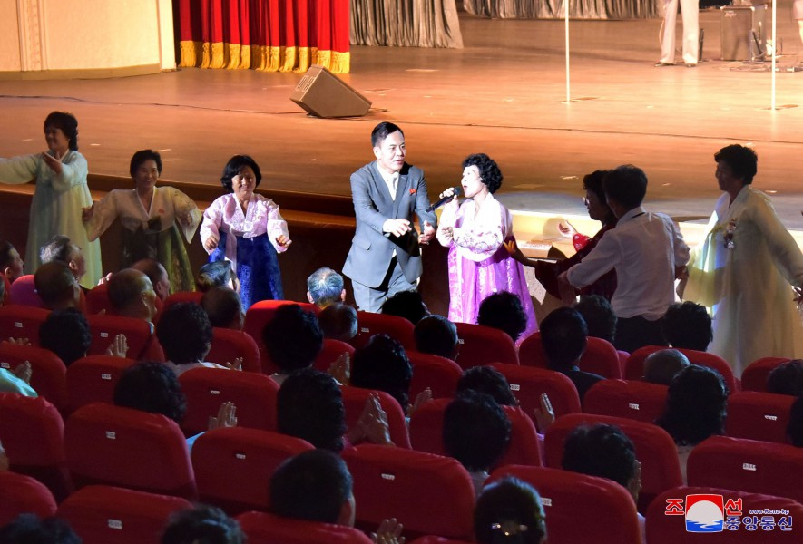 No Teatro de Arte Ponghwa, o secretário do Comitê Central do Partido do Trabalho da Coreia, O Su Yong, e o Ministro do Trabalho, Jin Kum Song, assistiram à apresentação artística do grupo central de propaganda artística e econômica junto com os veteranos de guerra, beneméritos e outros idosos desta capital.