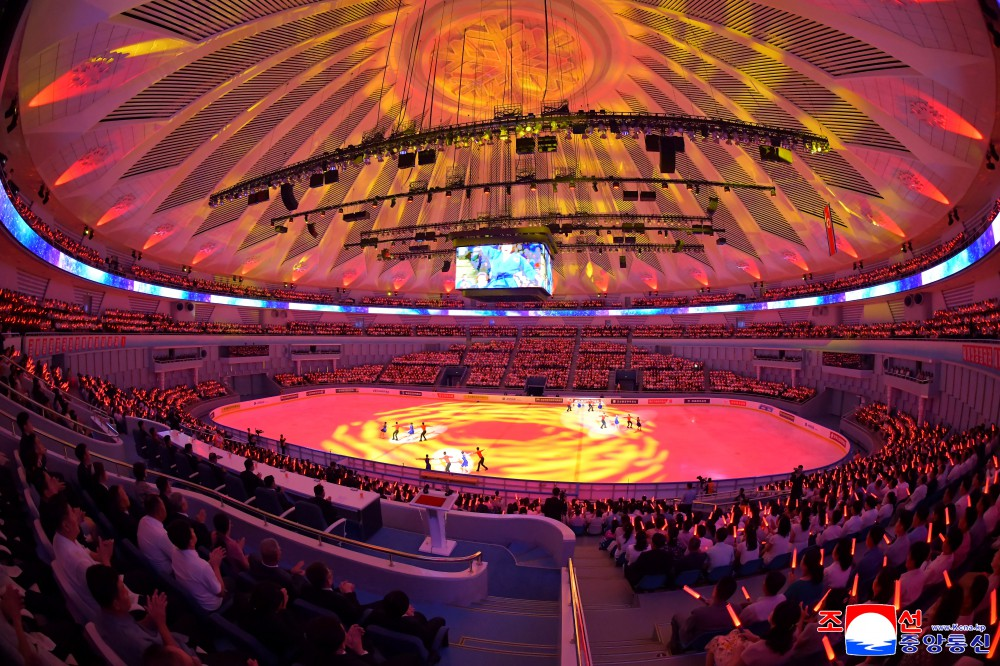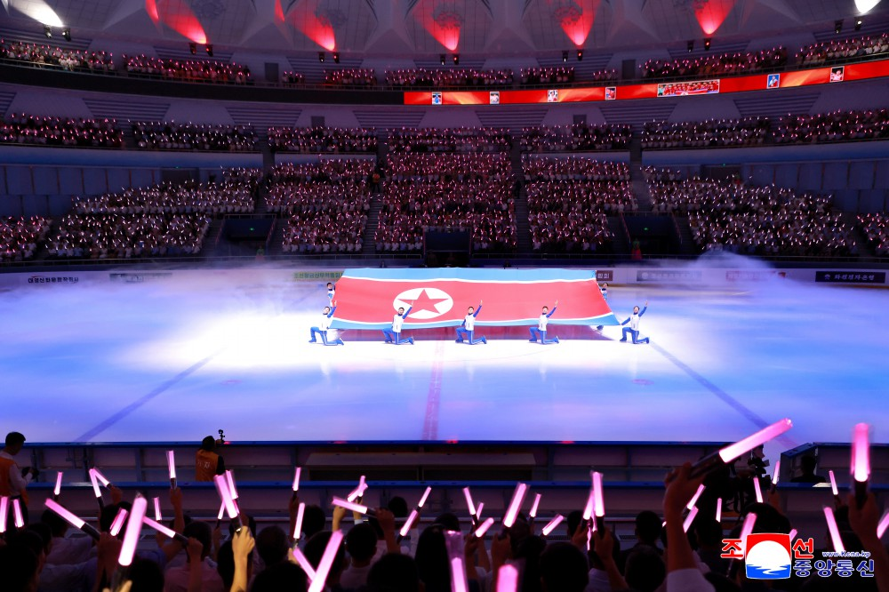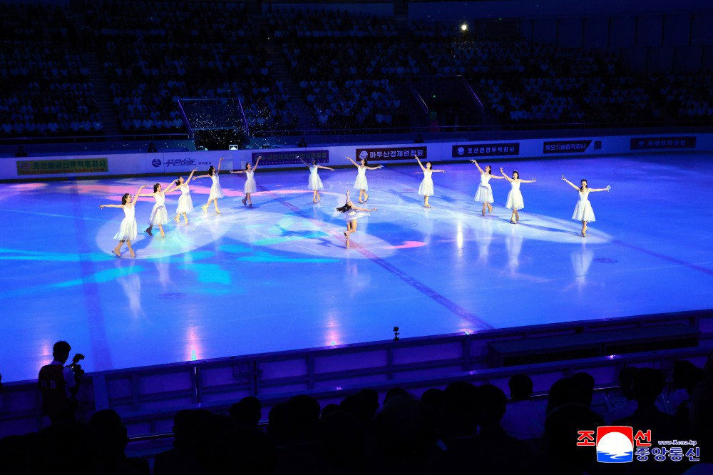 A apresentação artística de patinação, que refletiu em belas imagens o presente feliz e o amanhã ainda mais radiante do nosso povo, que desfruta plenamente da nova civilização florescente sob o cuidado do grande Partido, acrescentou alegria à cerimônia de reabertura.