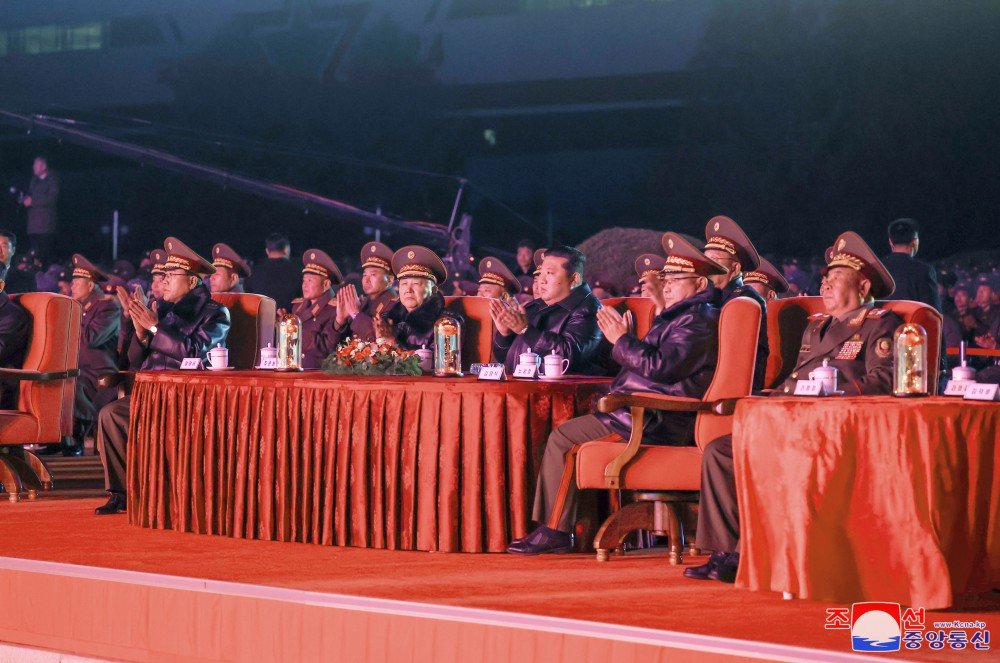 Quando Kim Jong Un chegou ao local, ressoaram os aplausos como demonstração da veneração infinita ao maior general insigne que escreve a epopeia do fortalecimento da capacidade de defesa nacional, cumprindo o anseio da história nacional de cinco milênios e abrindo a era de mudanças drásticas na construção da potência, deixando pegadas de serviço e perseverança no longo caminho para levar a feliz término a obra do país próspero e exército poderoso, responsabilizando-se pelo destino da pátria, do povo e de seu futuro eterno.