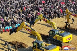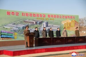 Realizou-se, no dia 26, no local a cerimônia de início da construção das fábricas de indústria local e do centro de administração de cereais do condado Hwangju com a participação dos funcionários dos órgãos do Partido e do Poder na província de Hwanghae do Norte e do condado mencionado, dos trabalhadores e dos construtores militares.