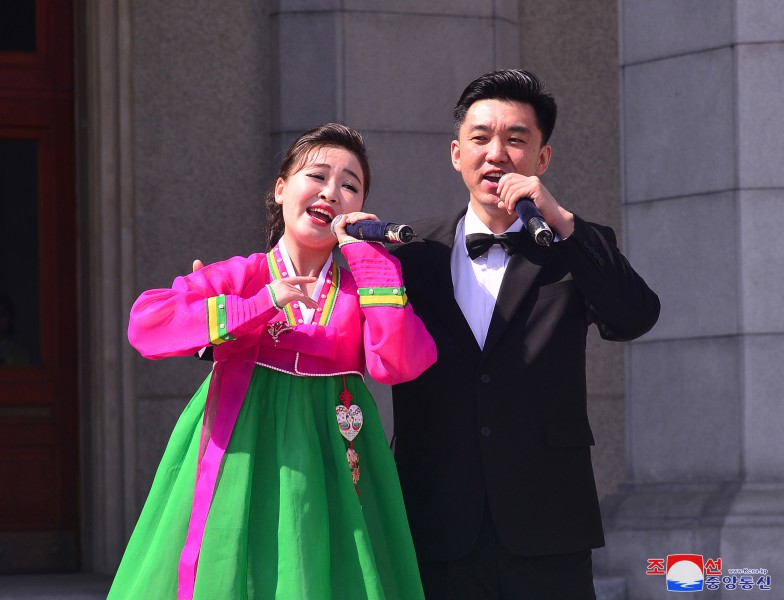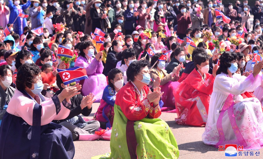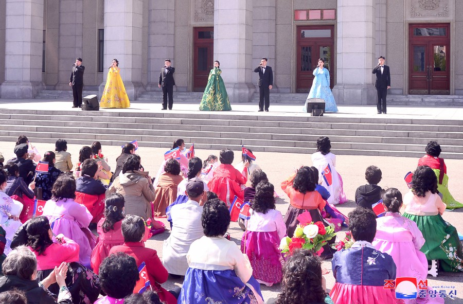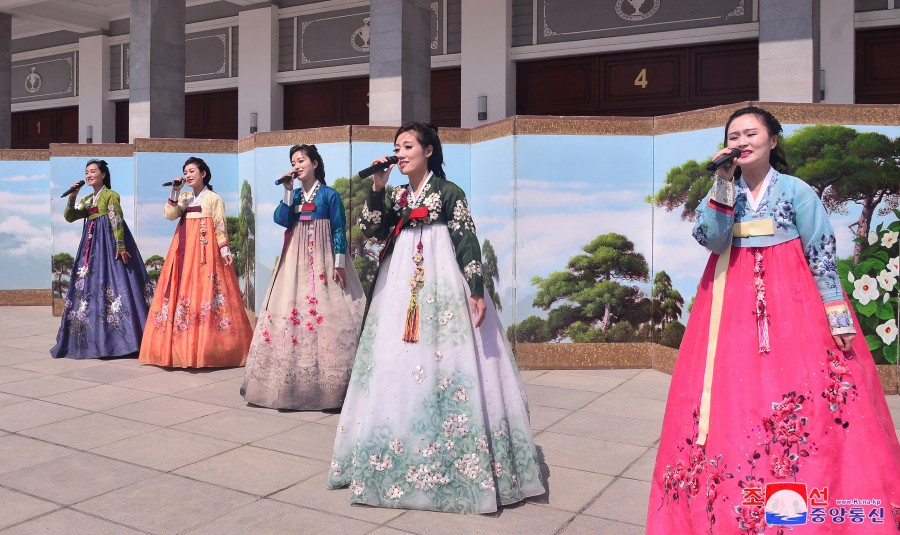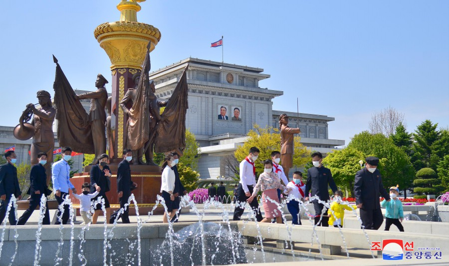 Os funcionários e trabalhadores colocaram cestos, buquês e ramos de flores ao pé das estátuas de bronze e imagens sorridentes dos grandes Líderes na colina Mansu da capital e em outros lugares do país.
