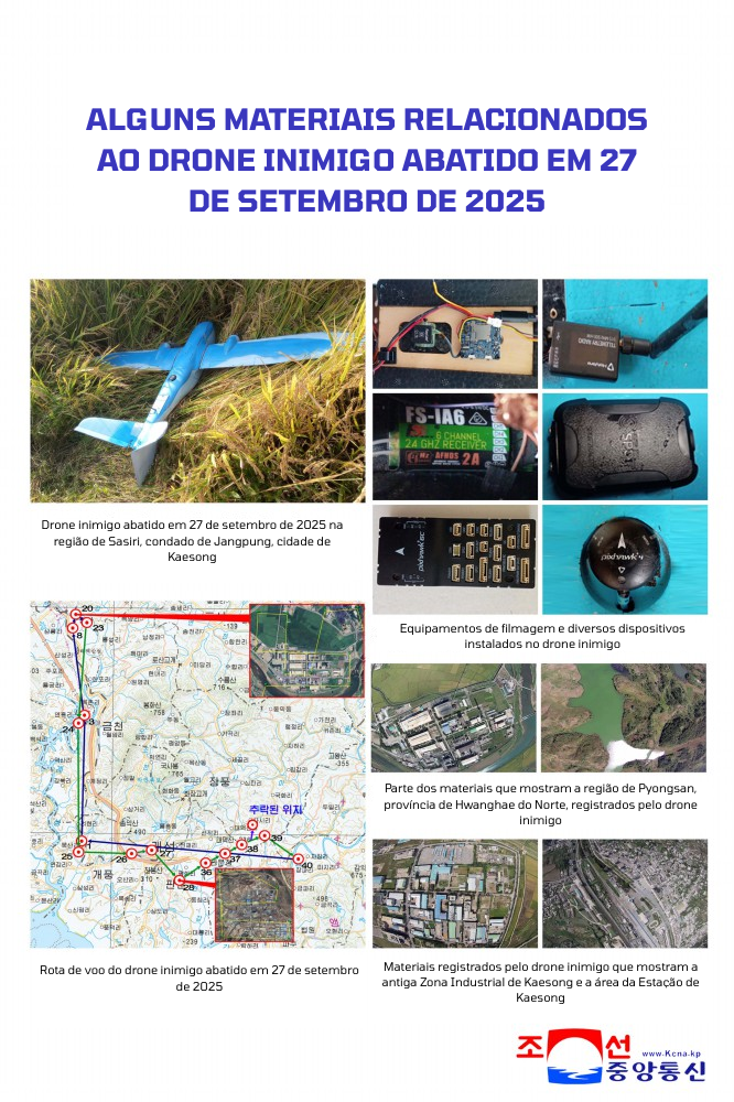 Por volta das 11h15 do dia 27 de setembro do ano passado, um drone inimigo que decolou da área de Jeokseong-myeon, cidade de Paju, província de Gyeonggi, invadiu o espaço aéreo da região do condado de Pyeongsan, na província de Hwanghae do Norte, e, ao retornar passando pelo espaço aéreo da cidade de Kaesong, foi derrubado às 14h25 por ataque eletrônico de meios técnico-militares especiais do 2º Corpo do nosso Exército, caindo em um arrozal da área de Sasiri, no condado de Jangpung, cidade de Kaesong.
