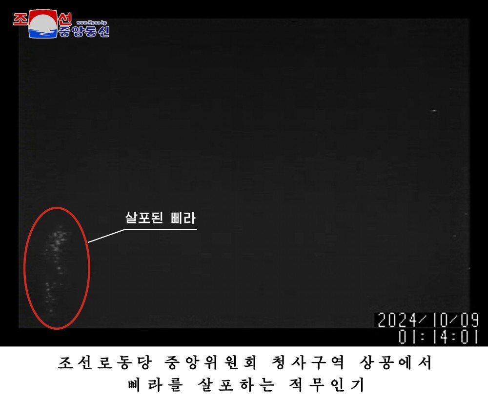 Nos dias 3, 9 e 10, também, aproveitando as horas avançadas da noite, a Republica da Coreia lançou seus drones para invadir o espaço aéreo sobre o distrito de Jung, na cidade de Pyongyang, a fim de cometer o abominável crime de espalhar numerosos panfletos de demagogia política anti-RPDC.