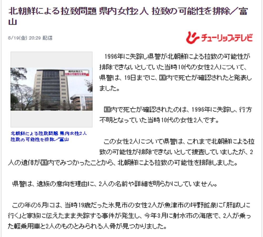 Recentemente, a policia do departamento de Toyama reconheceu oficialmente que morreram no interior do país 2 mulheres desaparecidas em 1996 e suspeitas de terem sido “sequestradas pela Coreia do Norte”.