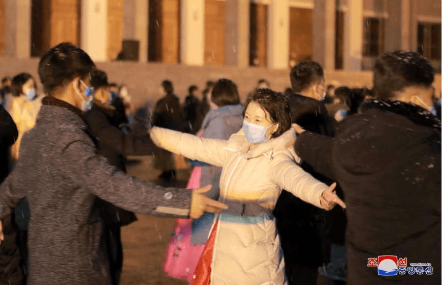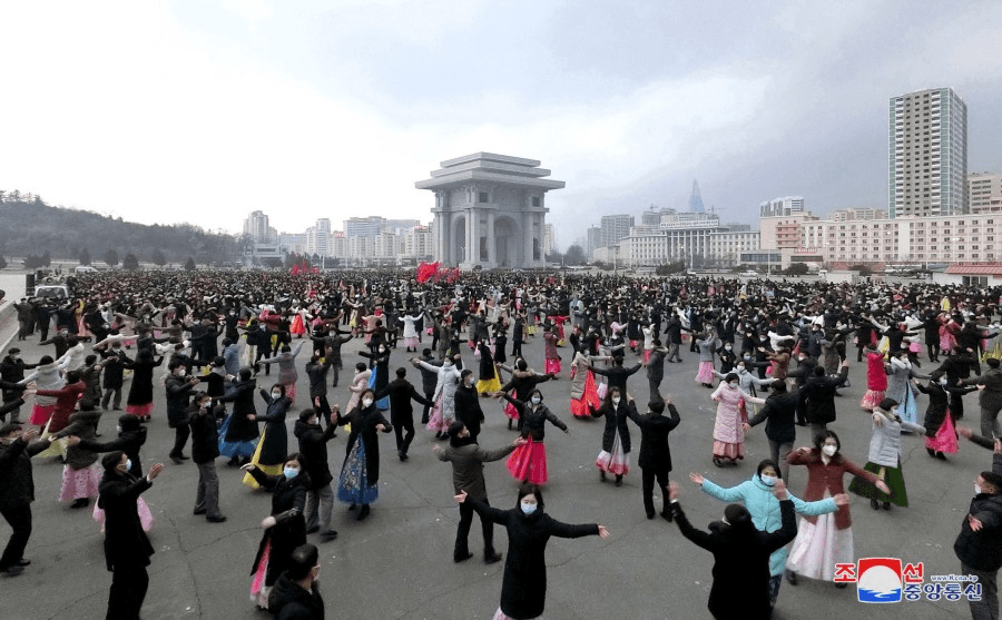 Eles dançaram convencidos de que, graças à sábia orientação dos grandes homens sem pares, a dignidade e o poderio nacional da RPDC atingiram o nível mais alto e foi aberto com antecedência o futuro maravilhoso da potência próspera.