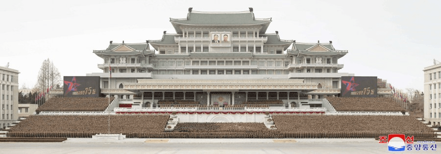 Kim Jong Un tira foto com os participantes nas festividades do 75º aniversário do Exército