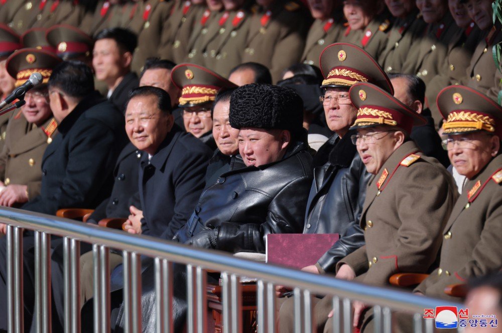 À chegada do Secretário-Geral, explodiram estrondosas vivas dos oficiais e soldados do Exército Popular ao General Insigne sem par que glorifica com eternas vitórias e honras o brilhante histórico de nossas forças armadas revolucionárias com sua extraordinária ideia da construção militar e sua abnegada direção e abre nova era dourada da construção do exército poderoso com a doutrina de dar primazia à ideologia.
