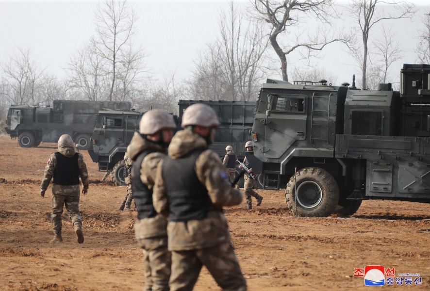 Nesse dia, o estimado camarada Kim Jong Un revisou a prontidão de combate real da companhia de assalto nº 8 vinculada à unidade encarregada de atacar o aeroporto operacional inimigo em direção à frente ocidental.