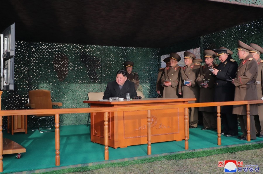 Kim Jong Un visita unidade artilheira da frente ocidental e dirige exercício de fogo