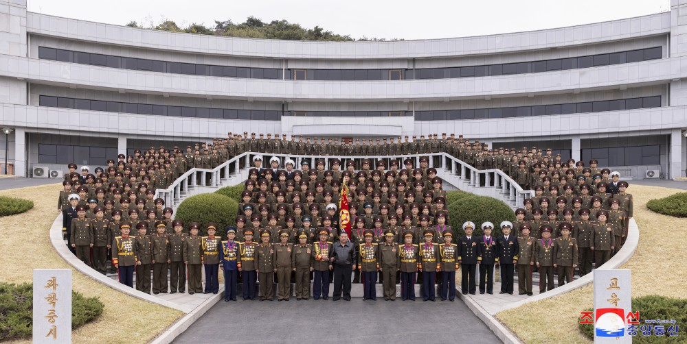 Fotografou-se com os professores, funcionários e estudantes expressando a esperança e convicção de que a academia será sempre fiel à sua missão e dever de ser a forjadora de talentos militares, que torna mais sólida a base principal das forças armadas da RPDC, dando continuidade firme à sua tradição gloriosa.