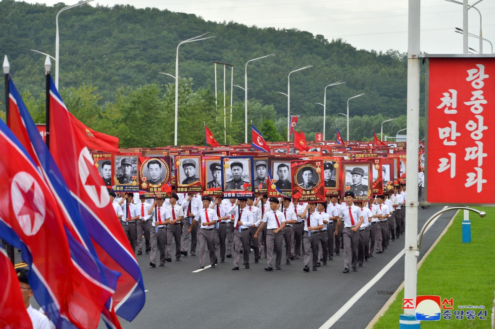 Os moradores aclamaram e aplaudiram as fileiras da juventude que exibiam a disposição de exterminar os inimigos ansiosos por acabar com o regime e vida feliz do povo coreano, se se atreverem a agredir, mesmo que uma polegada, esta terra sagrada onde correu o sangue dos mártires.