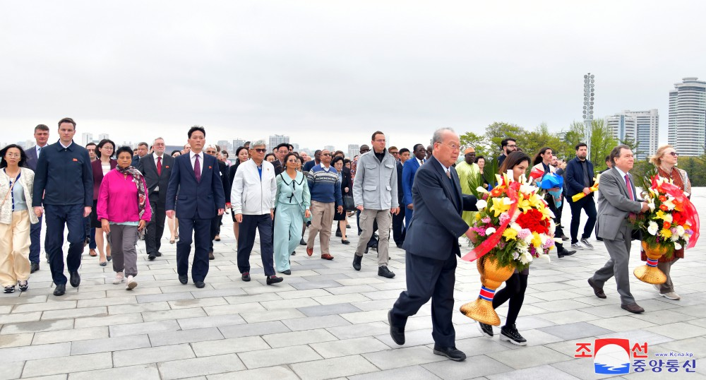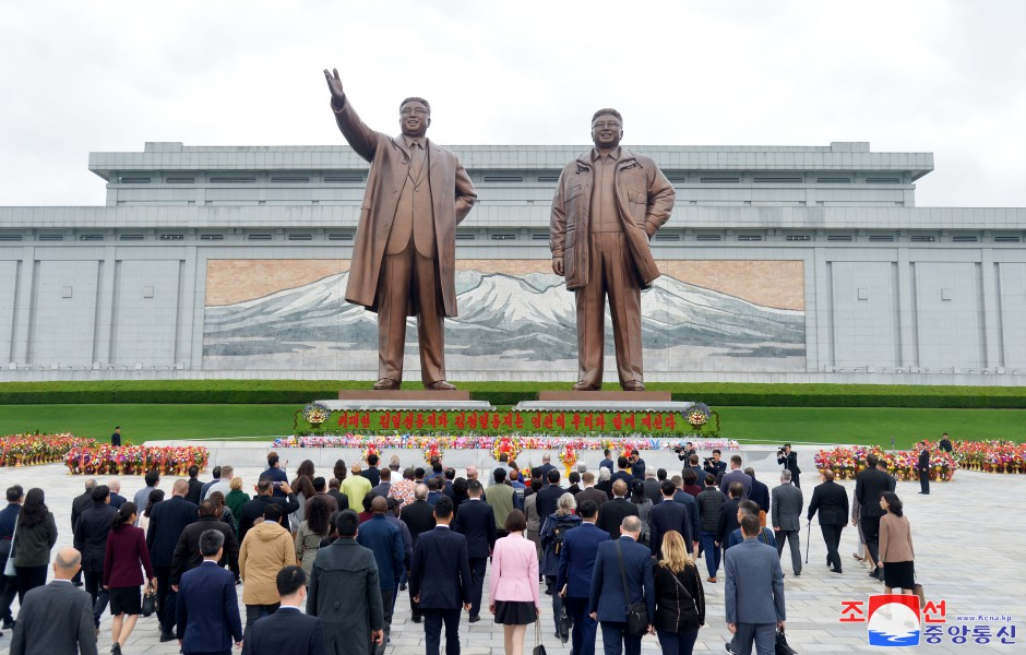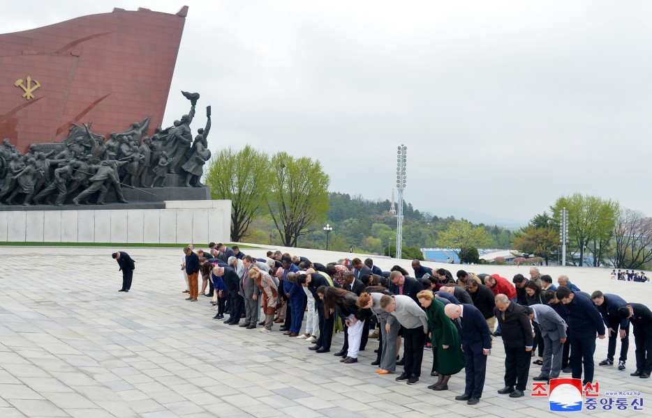 Pyongyang, 16 de abril (ACNC) — Por ocasião do 112º aniversário de nascimento do Presidente Kim Il Sung, os participantes no Seminário Internacional da Ideia Juche depositaram no dia 15 cestos e ramos de flores diante das estátuas de bronze do Presidente e do Dirigente Kim Jong Il, erguidas na colina Mansu da capital, que iluminaram o caminho de luta das massas populares trabalhadoras para defender e realizar a independência ao conceber e desenvolver a imortal ideia Juche.