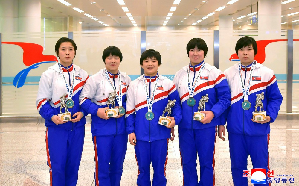Funcionários do setor esportivo, desportistas e familiares receberam, no dia 4, no Aeroporto Internacional de Pyongyang, os lutadores que retornaram após glorificarem a honra da Pátria.