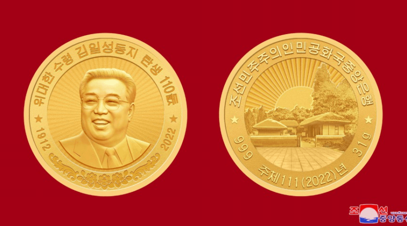Inscritas em sua parte superior estão as palavras “O 110º aniversário de nascimento do grande Líder camarada Kim Il Sung” e em ambos os lados da parte inferior, os números “1912” e “2022” bordeados com magnólias.