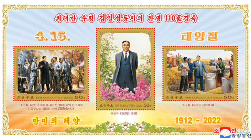 Pyongyang, 15 de abril (ACNC) Por ocasião do 110º aniversário de nascimento do Presidente Kim Il Sung, a Direção Estatal de Selos da Coreia publicou novos selos (um selo individual, uma folha e um folheto).