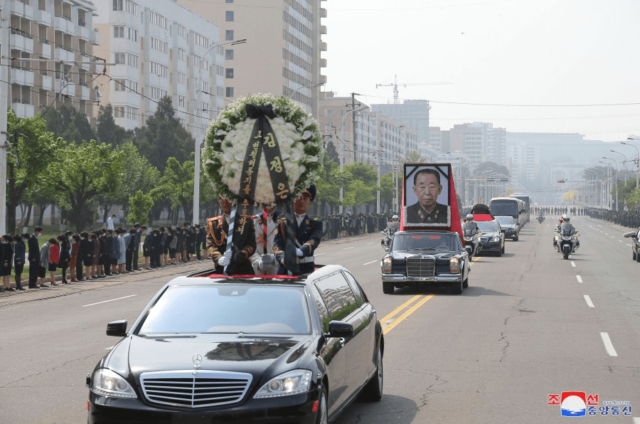 O carro passou pela coluna de bandeiras do EPC e da guarda de honra expressando homenagem a Hyon e foi para a rua sob a escolta de motocicletas.