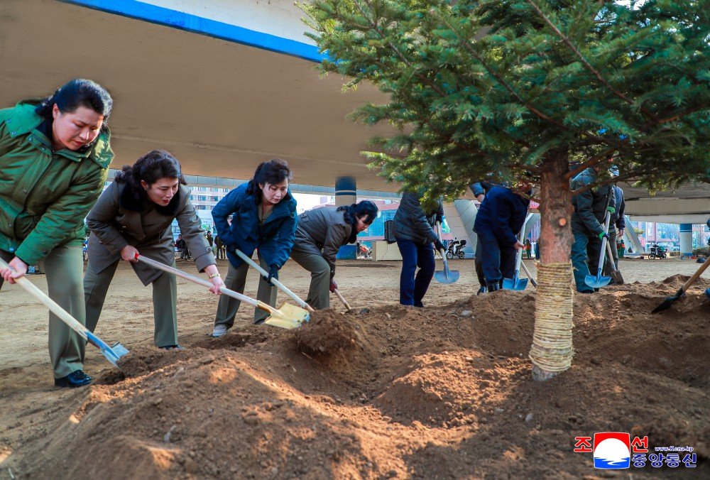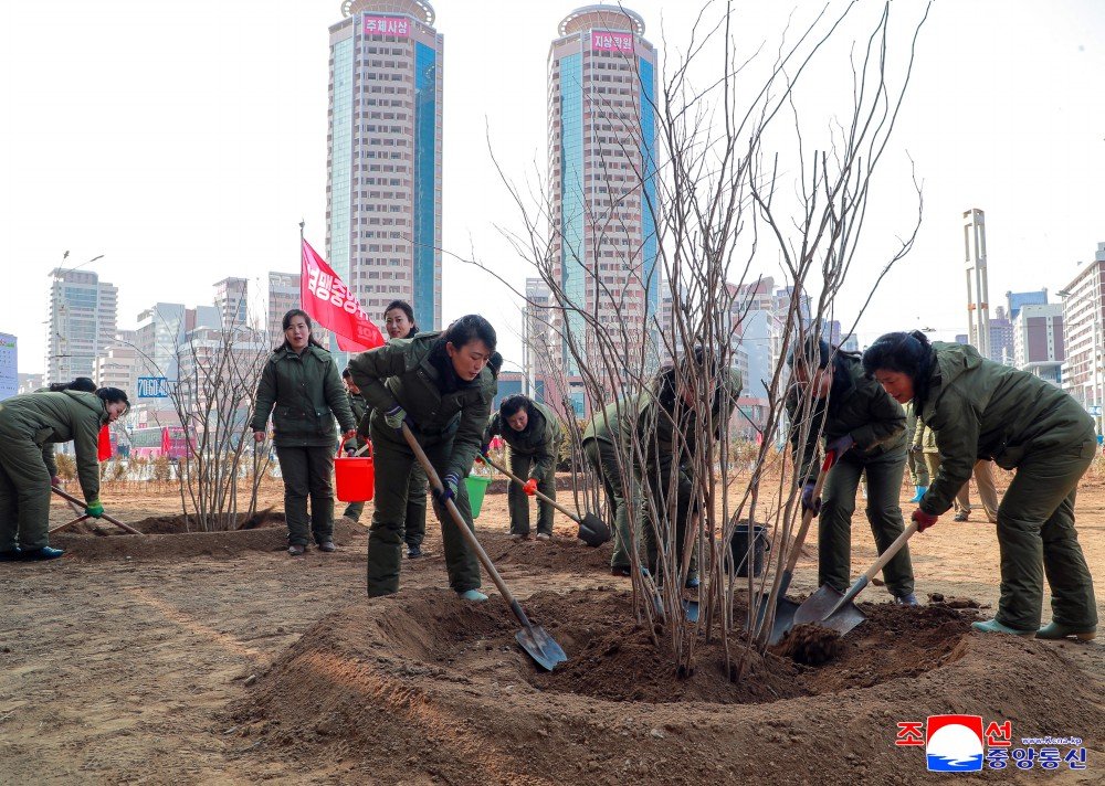 As funcionárias do CC da USMC e outras, juntamente com suas integrantes da capital, plantaram árvores no canteiro de obras para a construção de 10 mil residências familiares na terceira etapa da zona capitalina de Hwasong.